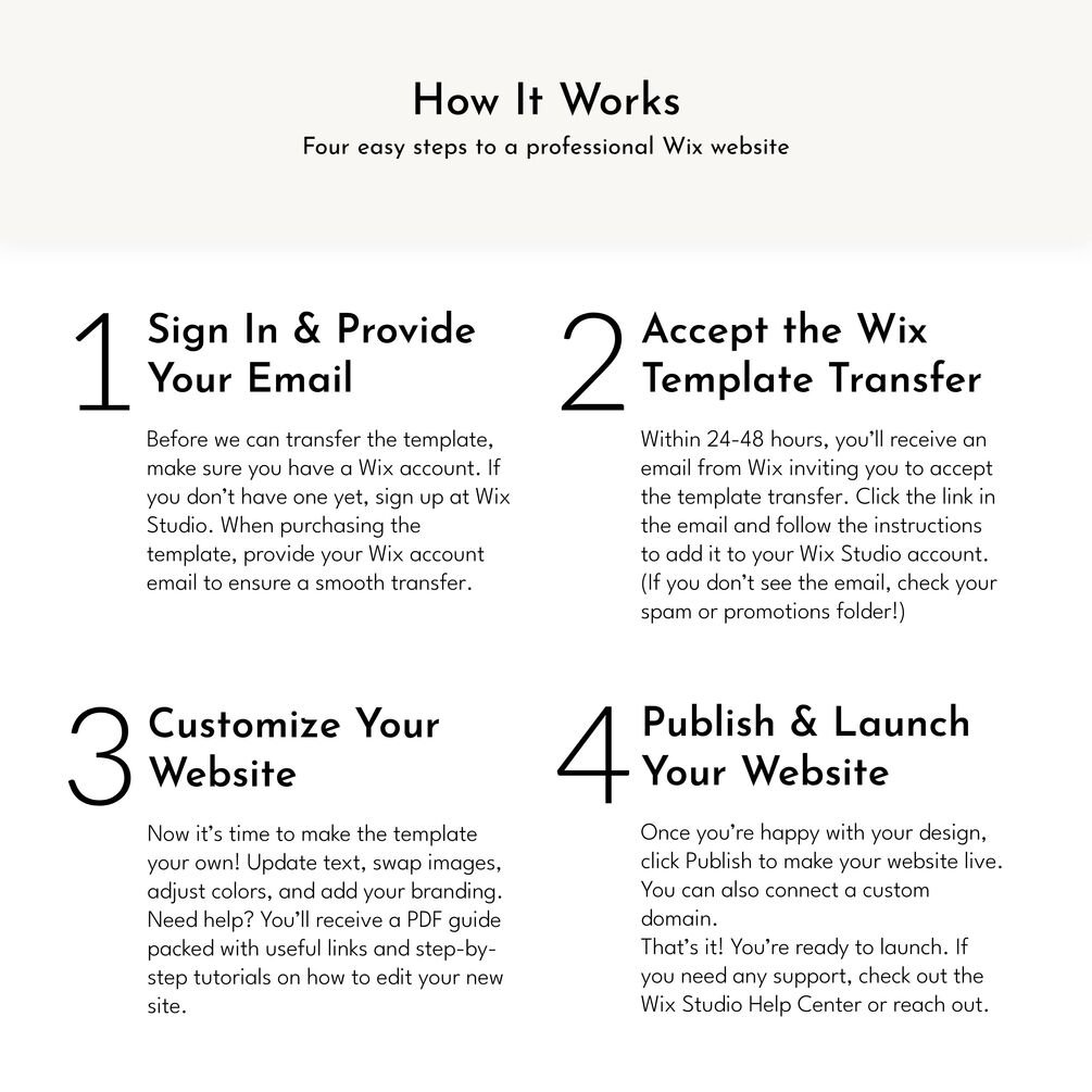 3️⃣ Template Transfer – Within 24-48 hours, you'll receive an email from Wix Studio to accept the website transfer. Please accept the transfer within 3 days of receiving the email. The email has the subject "A Wix Studio site is being transferred to you." We initiate the transfer, but Wix may take 24-48 hours to send the email.