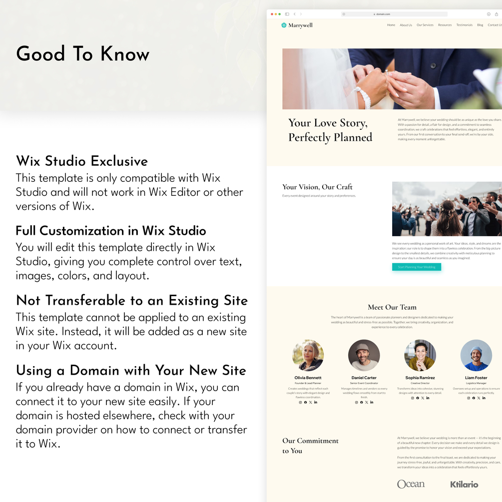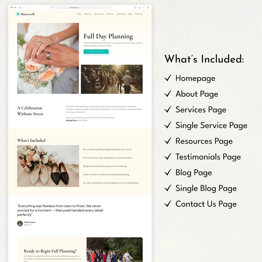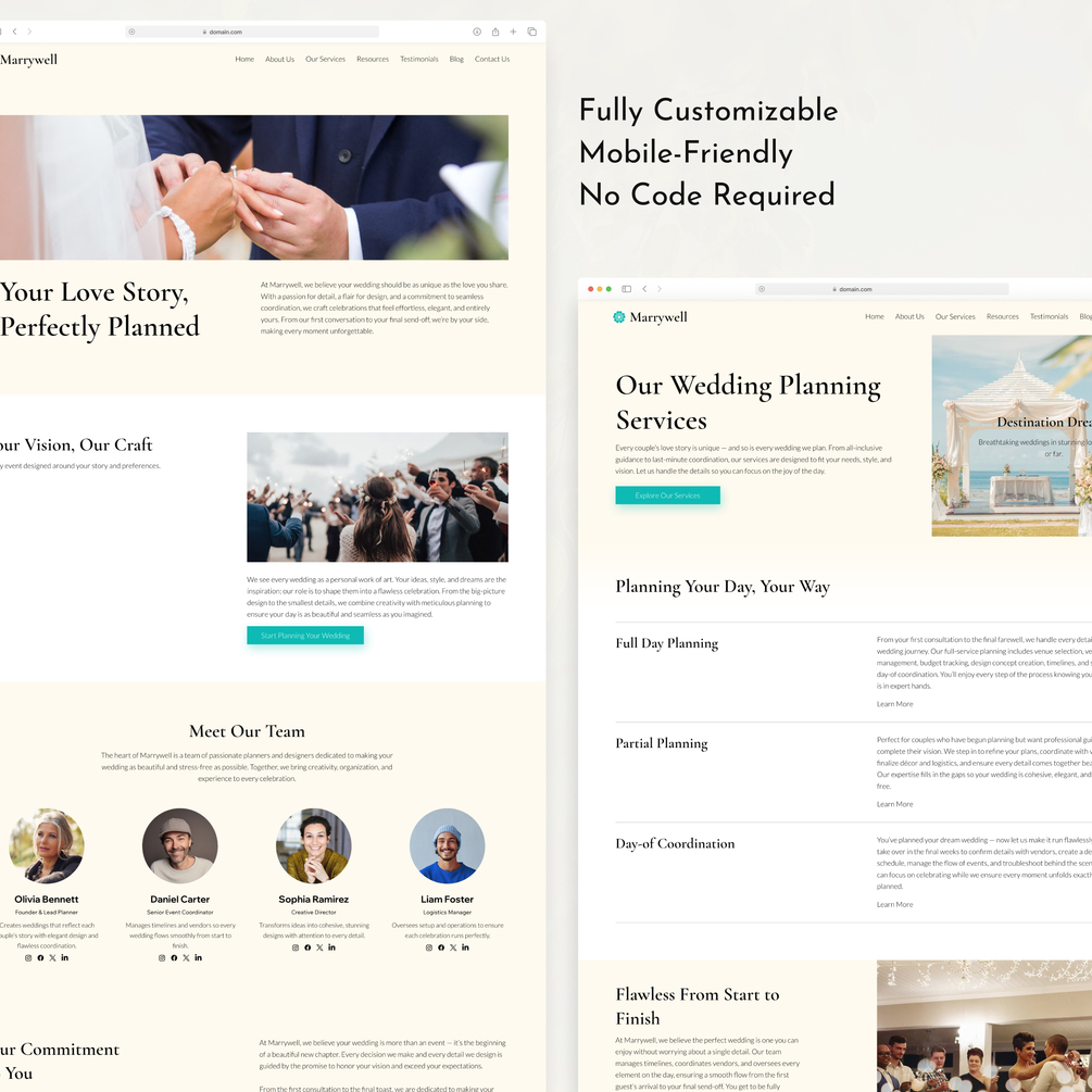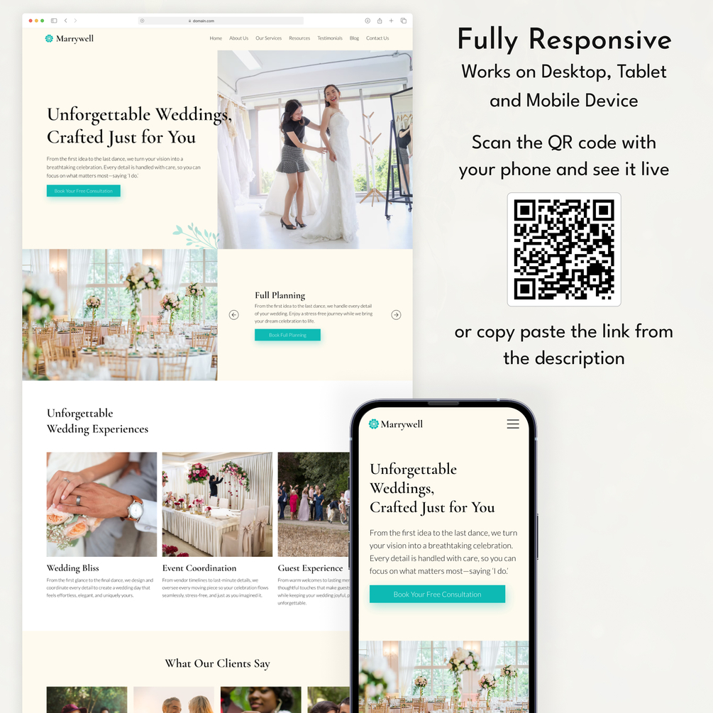 Launch your wedding planner business website quickly with the Marrywell Wix Studio Template. Perfect for wedding planners, event coordinators, bridal consultants, and service-based entrepreneurs, this elegant template includes everything you need to showcase your services, share testimonials, feature past weddings, and attract new clients.